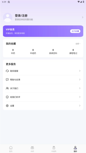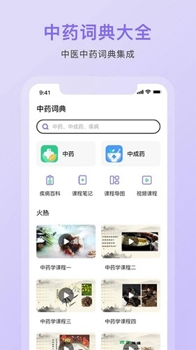 【中药词典首页页面】:该软件在这个页面为用户呈现了中药、中成药、疾病百科、课程笔记、医学视频等内容。