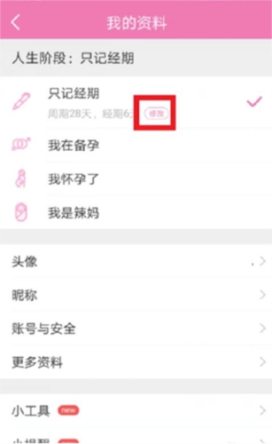 之后就能看到用户设置的经期时间旁边有一个“修改”的字样,接着点击“修改”进入修改页面。