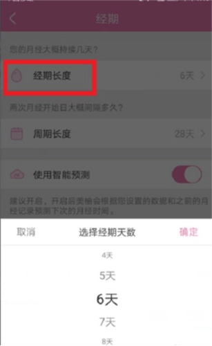 先找到经期长度的选项,点击后会出现一个数字输入框,这里显示的就是经期的时长。用户可以根据自身情况调整这个时间数值,调整完毕后点击确认按钮就可以了。