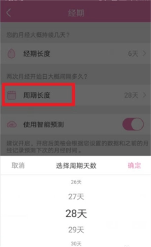 之后向下滑动就能看到月经周期长度的选项,点击进入后,可依据自身实际的月经周期情况进行调整,调整完毕后确认即可。