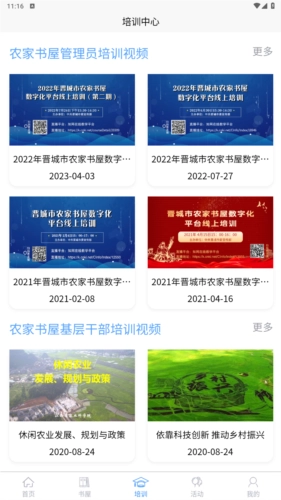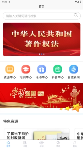 首页页面整合了资源中心、培训中心、活动中心、科普中心、晋城新闻等多个栏目,点击此处即可直接进入相应板块。