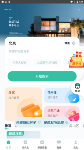 找农庄页面:这里解锁了所有农庄的详细信息,用户若感兴趣,可直接进行筛选,进而租赁房屋。
