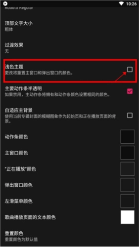 这里还能切换动作条颜色、主窗口颜色、“正在播放”颜色、弹出窗口颜色、左滑菜单颜色、歌曲播放页面的文本颜色,也可以重置颜色。