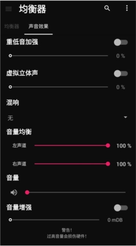 在均衡器的右侧,还能对声音效果进行设置。这里支持添加低音增强、立体声、混响以及音量增强等多种效果。