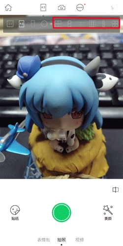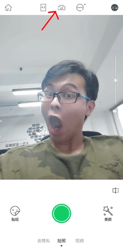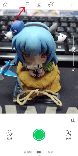 从拍照主界面进入后,点击界面上方箭头所指的按钮。