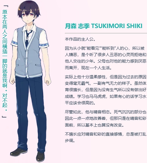 月森志季(つきもり しき)自出生起就能施展超能力,能够“看到”和“听到”他人的内心。