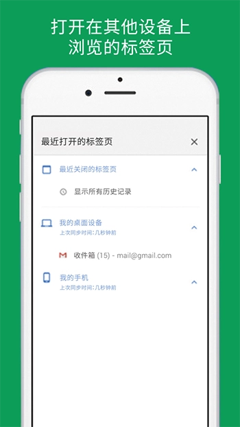 在任何设备上都能访问您的Chrome信息。登录Chrome后,您可以把书签、密码等信息保存到您的Google账号里,这样就能从其他设备上获取这些信息了。