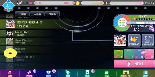我们在主界面除了可以自由选择歌曲外,还可以选择歌曲的难易程度。爱娜娜的歌曲大体有四个难度,分别为【EASY】【NORMAL】【HARD】【EXPERT】,细分的话,歌曲难度从1星到8星不等(在显示歌曲属性的部分有标出星级。)如果想要通关【EXPERT】的话,就先要解锁前面的三个难度等级。(打歌不容易~)