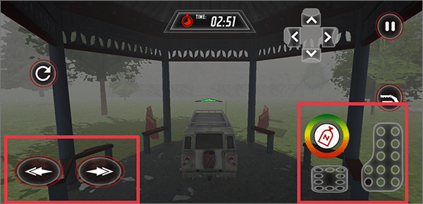 3、在屏幕左下角可控制车辆左右移动,右下角是刹车与油门。玩家需在倒计时结束前,依据汽车上方箭头的指示抵达目的地。
