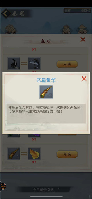 钓鱼想要钓到好的灵鱼,有好的工具也是非常重要的一件事情,玩家平常钓鱼的鱼竿是没有加成的,钓上来的灵鱼就非常的普通,而好的鱼竿有的可以一次性钓上来两条灵鱼,而且是必中,好的鱼竿玩家可以通过累计充值活动获取到,也可以使用钓上来的珍稀灵鱼兑换钓竿,钓竿兑换以后会在玩家的背包处,点击头像然后再从背包里面点击使用就会自动使用钓竿了。