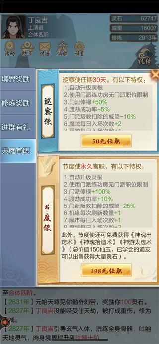 作为新手进入游戏第一件事就是挂机修炼加修为,起初3分钟一次,等到过了开光期之后就可以开启自动修炼,这时候你就可以渡劫和淬体了。