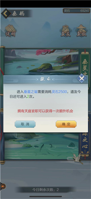 玩家没进入一次鱼塘都是要缴纳一定数量的灵石的,最低等级的鱼塘进入一次也需要花费三千个灵石,所以玩家一定要注重自己的灵石库存,在洞府里面不要忘了分配灵石产出,多进行副本探索积累灵石。