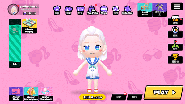 4、进入游戏主界面,在这可以进入商城、观看排行榜,查看相关任务等等,点击play进入游戏项目界面