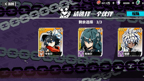 最后这个模式最好的地方就是还能让玩家体验自己没有的角色,一次通关可以选择一个随机的金色合紫色以及蓝色的角色加入自己的队伍,可以上场战斗基本上合自己的角色没有多大的差别,强化一样可以获取碎片。