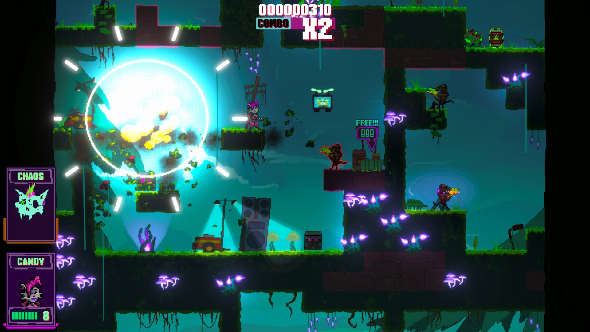 但这只是其中的一个方面,这部 2D 动作游戏同时还带着一股强烈的不羁气质,从粗粝像素美术勾勒的嘈杂赛博朋克世界,到糅合硬件合成风、金属乐与工业音乐的配乐,无不展现出曾令童年时的 Arron 如痴如醉的 80 年代动作片风范。而这在某种程度上,也与猫的可爱形象形成了一种有趣的反差。“负责所有关卡地块美术的 Sebastian Vasselbring 是一个超级猫奴。”Arron 补充道。“我们决定用动物角色来代替人类这事,就是因为他希望压低一下年龄分级,虽说游戏里还是充斥着暴力就是了!”