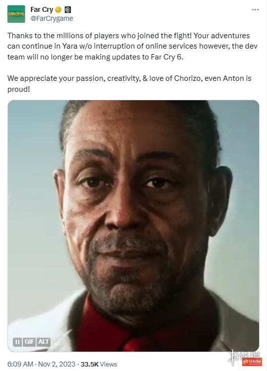 《孤岛惊魂》官方推特发布消息称:“衷心感谢数百万参与战斗的玩家们!大家仍可在亚拉大陆继续冒险探索,游戏的在线服务也会保持正常运行,但开发团队将不会再对《孤岛惊魂6》进行更新了。我们十分感激大家的热情投入、创意灵感,以及对西班牙辣香肠的喜爱——就连安东也会为此感到骄傲!”