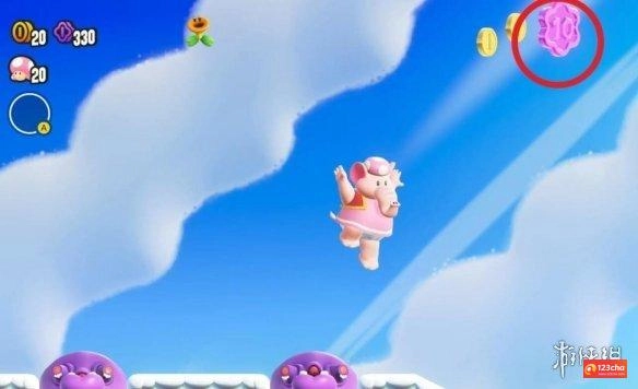 1、玩家进入关卡后,正常往前可看见悬挂在上层的紫币,玩家找准时机在滚动牛牛过来时,踩着它起跳即可获得。