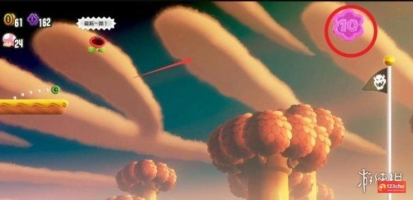 玩家进入关卡后会得到徽章“帽子降落伞”。在正常探索地图的过程中,两个旋转平台处能看到第一枚紫币;第二枚紫币位于中间旗帜的右侧,需要通过助跑跳跃才能获取;第三枚紫币在终点位置,等平台升到最高处时,玩家起跳就能捡到。