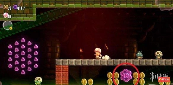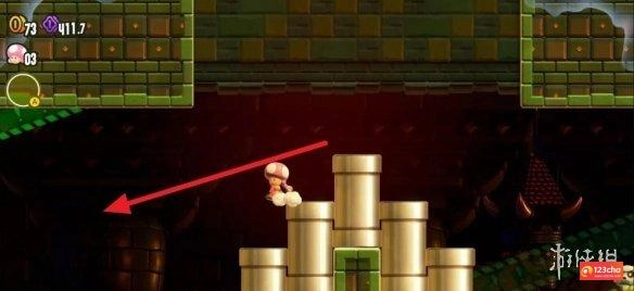 玩家进入神殿后,从中间旗帜右侧的管道钻进去,就能进入惊奇世界。这个世界里有两枚紫币,不过要留意:水管岩平原神殿的惊奇世界里,所有管道都会掉落,得注意躲避,小心别被砸中。