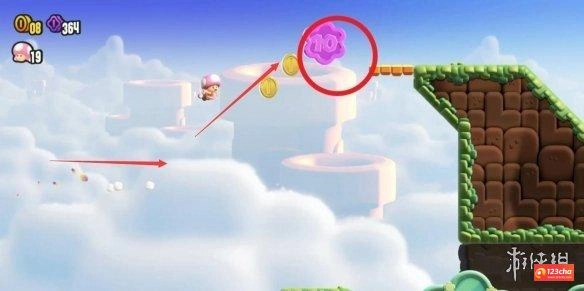 玩家进入关卡后能获取徽章-喷射跑,此关卡的紫币均是裸露着悬浮在空中的。借助徽章喷射跑的技能,在平台上进行助跑,悬于空中冲刺收集金币,当拿到最后一颗金币时起跳,就能碰到紫币了。