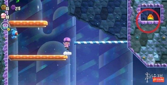 3、通过中间旗后,往上走,在第二层,利用泡泡能力攻击红圈的花,就能打出来第三枚紫币。