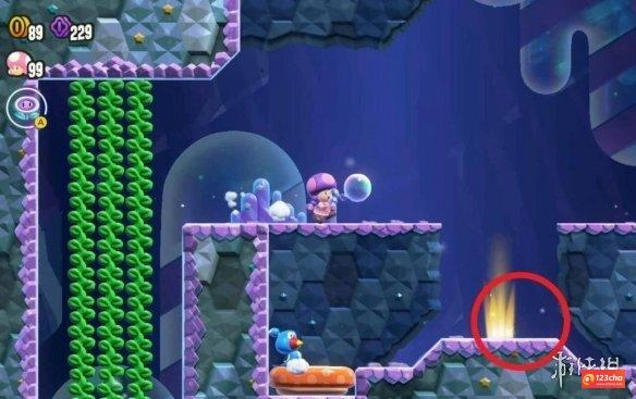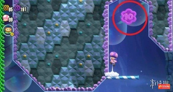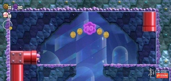 玩家进入关卡获取泡泡能力后,左侧会出现第一枚紫币;第二枚紫币需穿过红色管道才能找到;通过中间的旗子后向上移动,到达第二层时,借助泡泡能力攻击带有红圈的花朵,即可获得第三枚紫币。