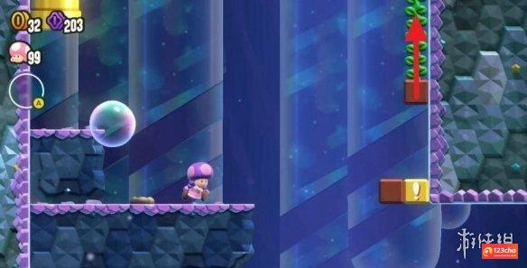 1、玩家开局选择徽章-出现砖块,进入关卡获得泡泡能力后,可以在左侧看到第一枚紫币,利用吹箭仔的箭可以轻松获得。
