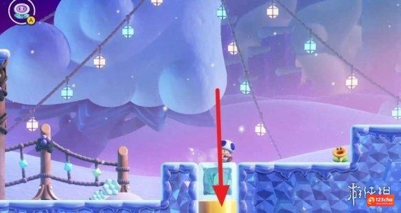 4、处于中间旗的位置时,借助敌人推来的大冰块向右移动,遇到一朵小蓝花后,就能在终点处拿到第三枚紫币了。