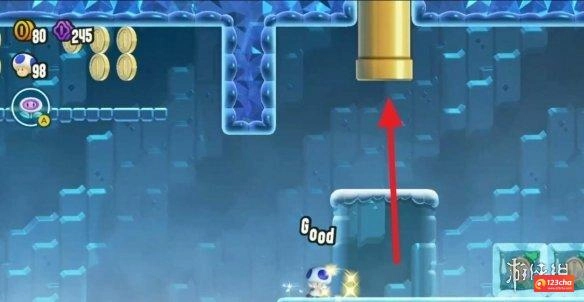 2、坐两次黄色管子上的冰块把冰块坐碎,进入管子后会有冰块向右推,顺路获得一些金币,到尽头管子离开。