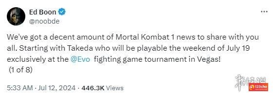 在《真人快打》圣地亚哥动漫展的小组讨论开启前,NetherRealm 表示,他们会在7月15日(星期一)的美国中部时间上午8点、太平洋时间上午6点、东部时间上午9点以及香港时间晚上9点,首次公开“武田”的角色形象。尽管“武田”的具体发布日期尚未敲定,但NetherRealm的负责人Ed Boon已证实,7月19日所在的周末,该角色将在拉斯维加斯举办的EVO格斗游戏锦标赛上开放试玩!