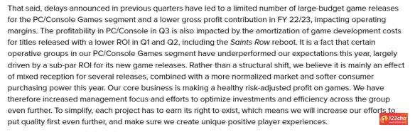 此外财报中还提到,今年公司PC和主机游戏部门的某些业务组的表现低于预期,主要是由其新发布的游戏的投资回报率不高所驱动。