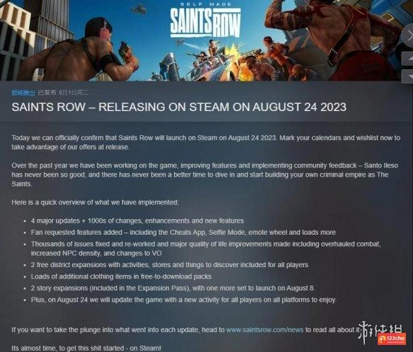 根据《黑道圣徒:重启版》在Steam平台的页面信息,这款游戏的PC版本将在8月24日结束Epic商店的独占期,正式于Steam平台发售。此外,游戏还会推出众多免费更新内容,具体涵盖额外服装、全新区域活动、自拍模式、战斗系统的大幅调整以及NPC密度优化等方面。