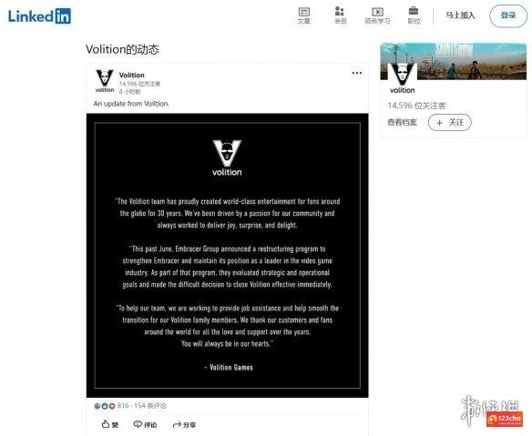 《黑道圣徒》系列的开发商Volition Games于今日通过领英发布公告,宣布自即日起正式关闭解散。