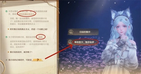 5、前往墓碑群,依次调查三处线索,线索含义如下: