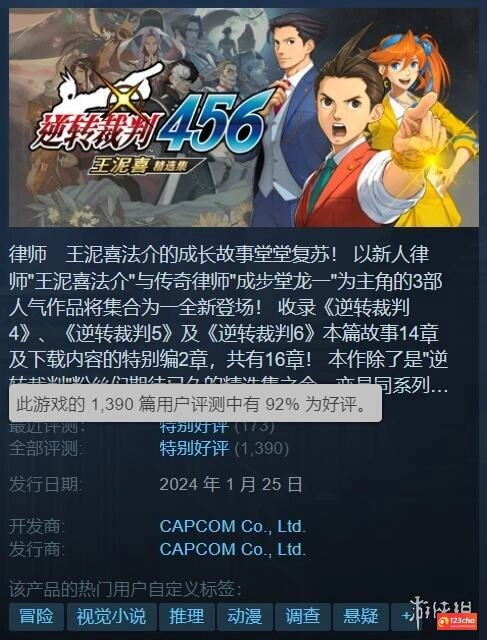 《逆转裁判456:王泥喜精选集》在Steam平台收获了「特别好评」的总评价,1390条用户评测里好评率高达92%,堪称一款十分出色的推理冒险视觉小说游戏。
