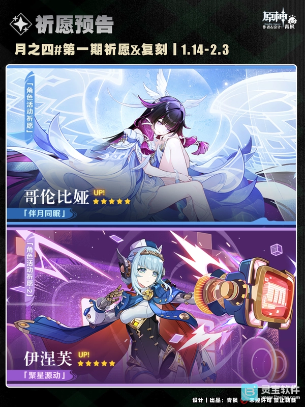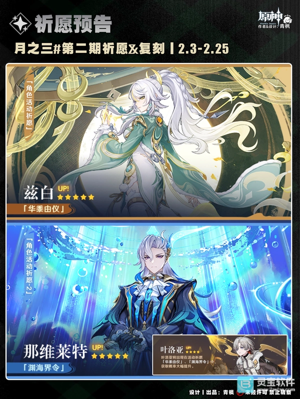 复刻限定角色:上半祈愿-伊涅芙(雷元素·长柄武器)、下半祈愿-那维莱特(水元素·法器)