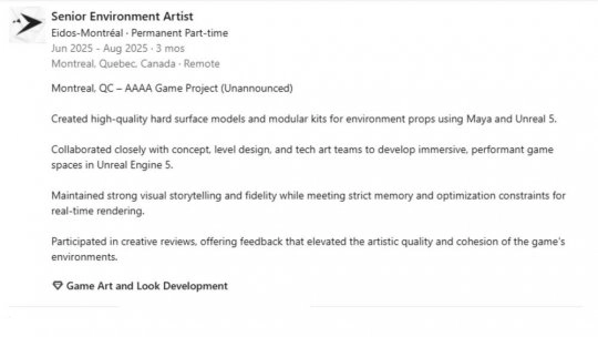 尽管近年来针对Eidos Montreal工作室的报道大多围绕其取消众多项目的情况展开,但最新的线索显示,该工作室目前或许正在推进一个重要项目。有用户Timur222在社交平台Blue Sky上留意到,该工作室的一名资深环境美术师在自己的履历里记录了一段参与“AAAA游戏项目”的工作经历。