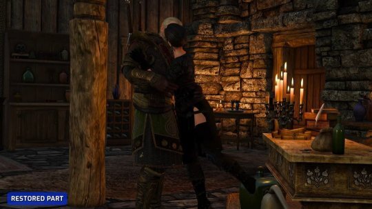 此外,模组还还原了任务结尾杰洛特与叶奈法牵手的温馨画面,并为该任务新增额外对话。还原内容远不止于此,还包括:希里与狂猎战士的附加对话场景、杰洛特返回凯尔莫罕后与艾斯凯尔的新增对话,以及在“血腥男爵”任务中曾被删除的、允许玩家明确表达是要杀死还是解除尸婴诅咒的选项。据推测,最后一项改动因不影响任务最终走向而在原版中被删除。