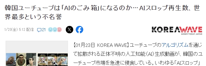 不久前,数据站媒体公布了最新的AI劣质视频点击量全球排名,韩国在榜单中遥遥领先、一骑绝尘。该媒体还针对韩国沦为“AI垃圾箱”所引发的社会性危害,深入分析了其严重程度。