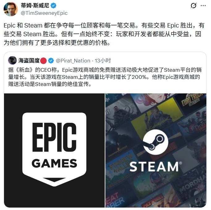 不过蒂姆·斯威尼对这则报道似乎并未放在心上。他回顾当前局势表示,Epic商店与Steam在用户数量和销售额方面存在竞争关系,偶尔Epic会处于领先位置,但在不少交易中Steam仍占据上风。即便双方处于这样的竞争状态,对于报道中提到的因免费赠送导致“Steam版销量上升”这一情况,他觉得这为玩家和开发者提供了更多选择,对双方而言都是有益的。