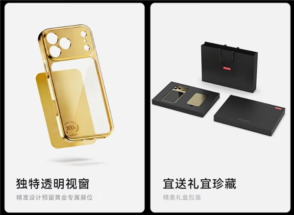 从官方介绍页面来看,这款手机壳通体黄金配色,但并不是整体采用黄金打造,而是分为两部分:手机壳、金片。
