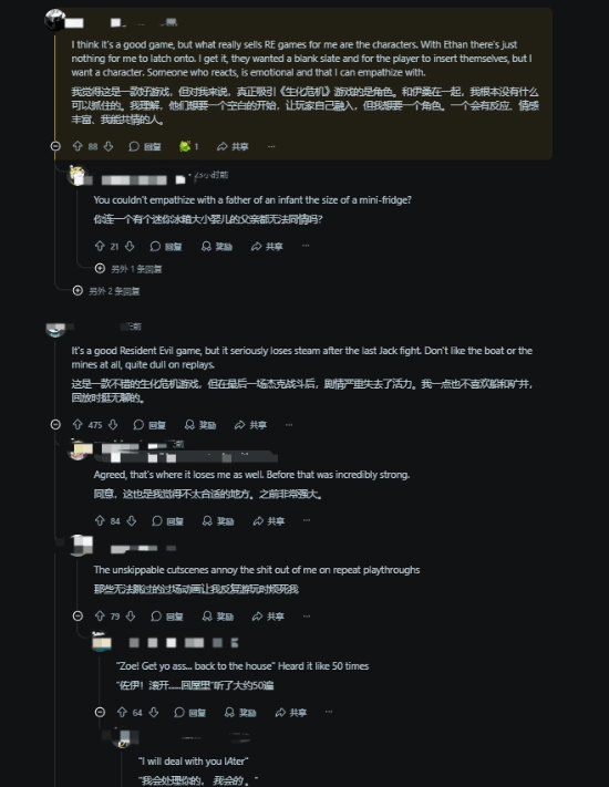 而玩家在讨论《生化危机7》的缺点中,遇难船、矿场这些后期章节成为了reddit玩家主要吐槽的点。一名玩家表示:“一个很棒的起始区域,还有后期越来越没意思的区域,说实话,这可以说是生化危机的缩影。”