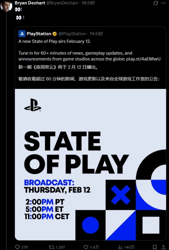 PlayStation State of Play是索尼主办的游戏发布会,主要用来发布旗下工作室及相关游戏的最新信息、实机演示等内容。据了解,最新一期发布会已确定于北京时间2月13日上午6点举办,时长将超过1小时。