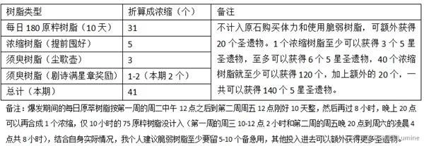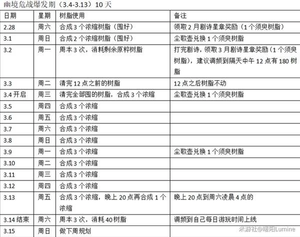 备注:上面的浓缩是浓缩树脂的缩写,3月13日20-24点的30原粹树脂还能争取再用用,如果最后计入的树脂数量没有满120,可以消耗脆弱树脂凑整数补满120再领多1个额外的5星圣遗物,3月14日的凌晨0-4点的30原粹树脂,一般很少有玩家会用到,只能放弃了。