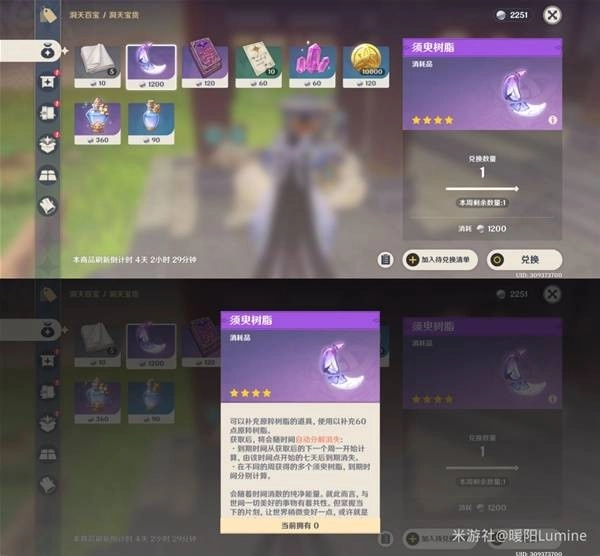 然后是尘歌壶兑换须臾树脂啦,2.28剧诗星章奖励领取的和3.1尘歌壶兑换的均在3.9过期,只要在3.4号当天使用就好。3.1-3.8的尘歌壶兑换的建议到了3.4再去兑换,不然不小心使用了就少计入60原粹树脂了。3.9-3.14还可以兑换1个,本次最多能用到5个须臾树脂。