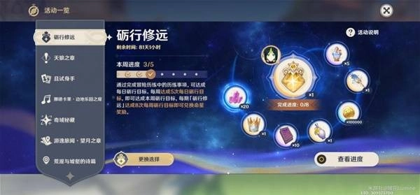 首先是2月23日-2月28日领取2月的剧诗星章奖励中的「须臾树脂*1」,我个人建议月初打完「幻想真境剧诗」之后,先领取完挑战奖励,而满星章的奖励留到月末看版本更新信息中「幽境危战开启时间」去领取,因为有些时候,「幽境危战」开启的时间刚好是月末开启跨2个月份或者月初开启,以及刚好覆盖了须臾树脂保质期时间,可以在紊乱爆发期间多花一个须臾树脂。