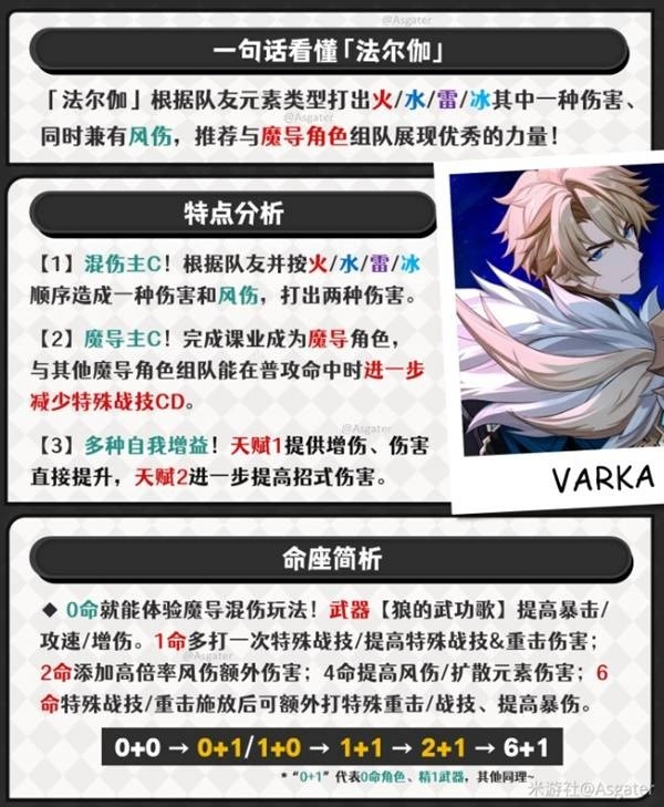 ① 法尔伽作为魔导主C,核心输出围绕染色元素和风元素的直接伤害展开,他的混伤机制会让人联想到恰斯卡,不过二者之间存在明显区别——