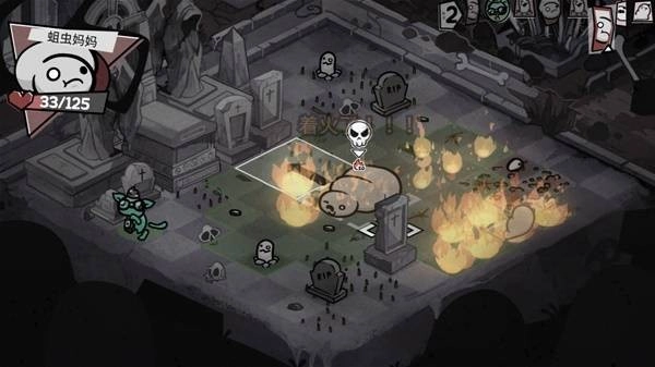 骸骨地的最后我们打后空翻之神,我们相当克制这个家伙,炸弹直接扔脸上躲不掉还会加燃烧,外加上boss比较多动,燃烧叠的很快,很快这个家伙就附到我身上来了,先炸了两轮自己然后给了自己一拳把恶灵打出来,下一回合它就烧死了