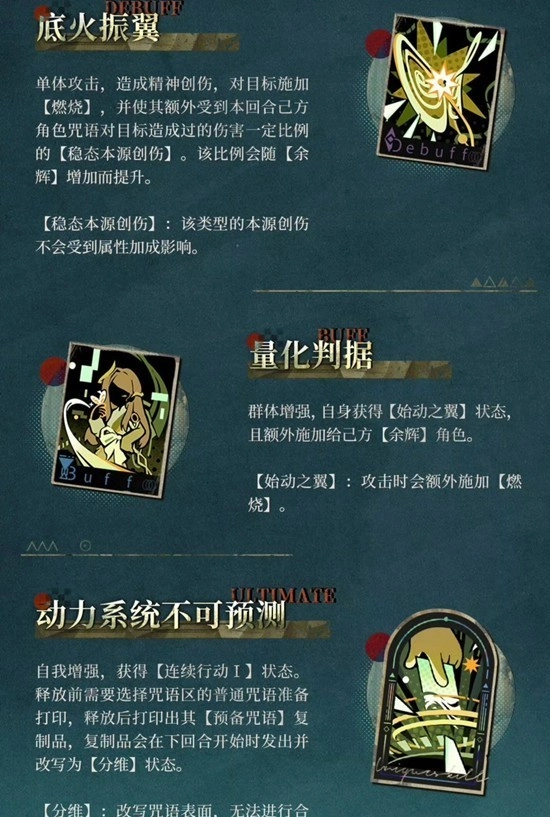 队伍增益:提升暴击率,加速激情循环,提升燃烧层数和余辉数量,强化创伤加成和术法威力。