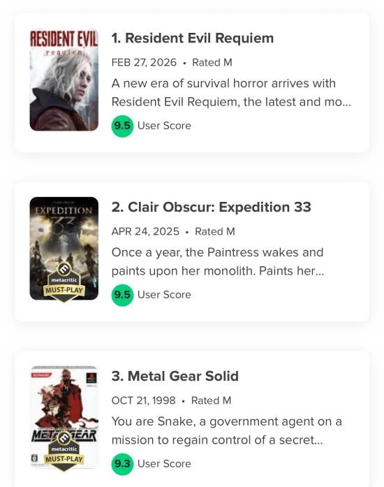 《生化9》超越此前备受好评的JRPG《光与影:33号远征队》,以微弱优势登顶历史榜首。